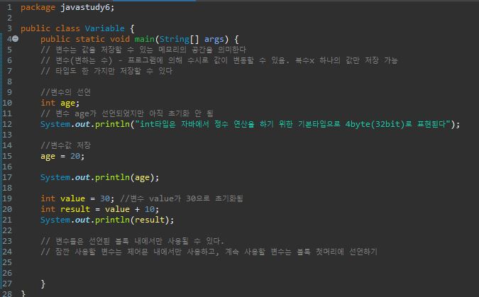 변수는 선언 후 원하는 값으로 초기화해주거나, 변수 값을 저장해줄 수 있다.